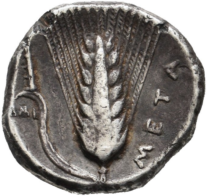 LUCANIA, Metapontum. Circa 340-330 BC. AR Nomos (20 mm; 6.82 g). A plated forgery struck under the magistrates Pa... and Ami.... Head of Leukippos right, wearing Corinthian helmet, lion's head to left and monogram ΠA below chin / META, Barley ear with AMI below leaf and standing club above leaf. Edge damage at 10 o'clock revealing the base metal core. Some roughness in fields. Deeply toned. A highly interesting ancient forgery that might be a product from the official mint.