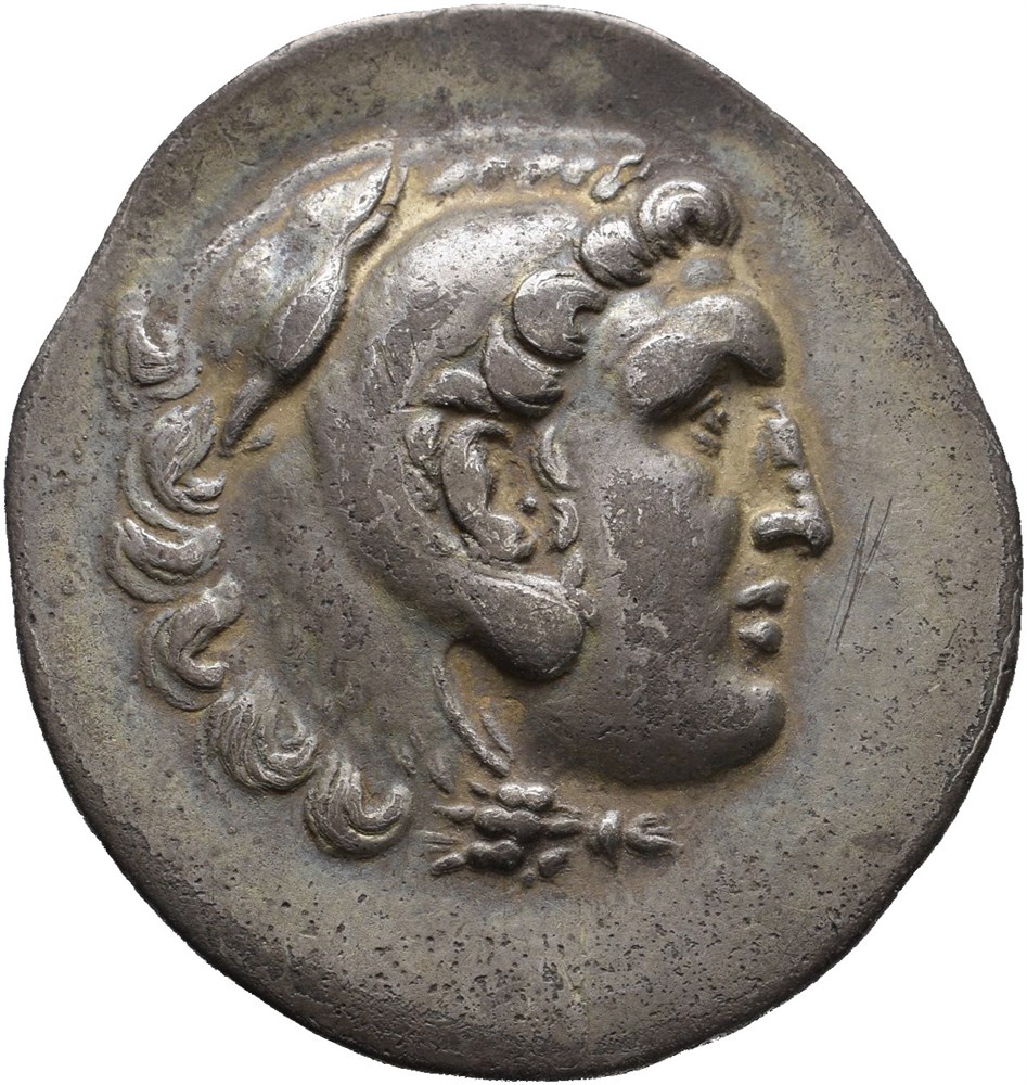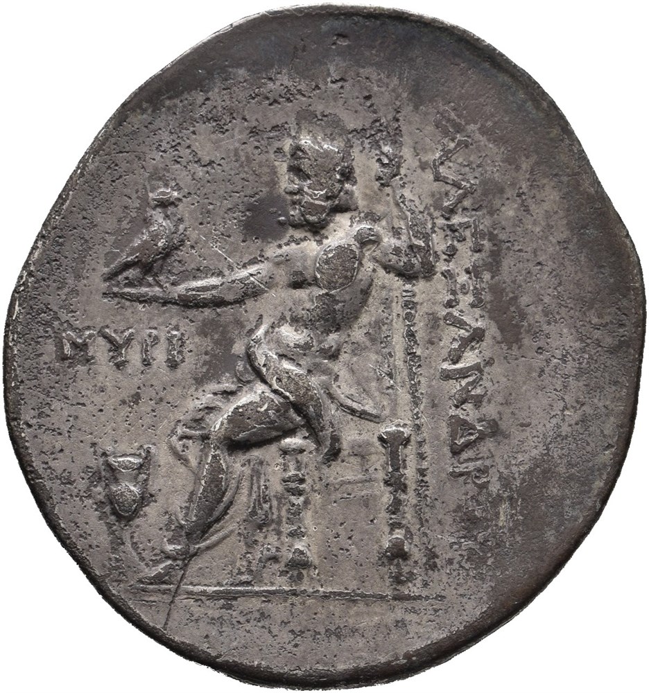 AEOLIS, Myrina. Circa 188-170 BC. AR Tetradrachm (36 mm; 16.22 g). In the name and types of Alexander III of Macedon. Head of Heracles right, wearing lion skin headdress / AΛEΞANΔPOY, Zeus Aëtophoros seated left on throne, holding eagle in outstretched right hand and scepter in left; MYPI (Myrina) to left; amphora in front of feet. Some roughness and several small scratches in fields. Some scattered corrosion in fields and a few short scratches. Attractive deep iridescent cabinet toning.