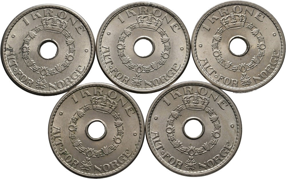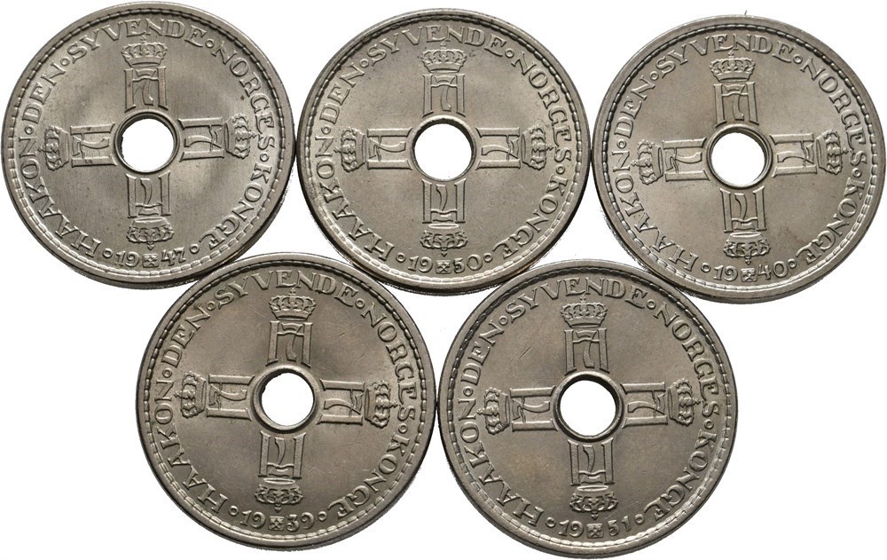 Lott 5 stk. 1 krone 1939, 1940, 1947, 1950 og 1951.