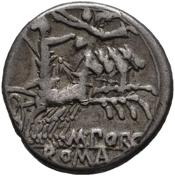 M. Porcius Laeca. 125 BC. AR Denarius (3.86 g). Rome mint. Helmeted head of Roma right; X (mark of value) below chin / Libertas, holding vindicta and pileus, driving quadriga right; above, Victory flying left, crowning Libertas. A few small scuffs on obverse. Deeply toned.