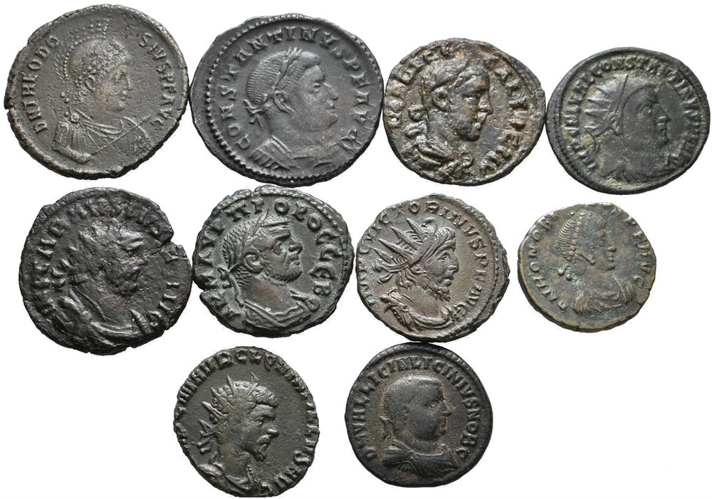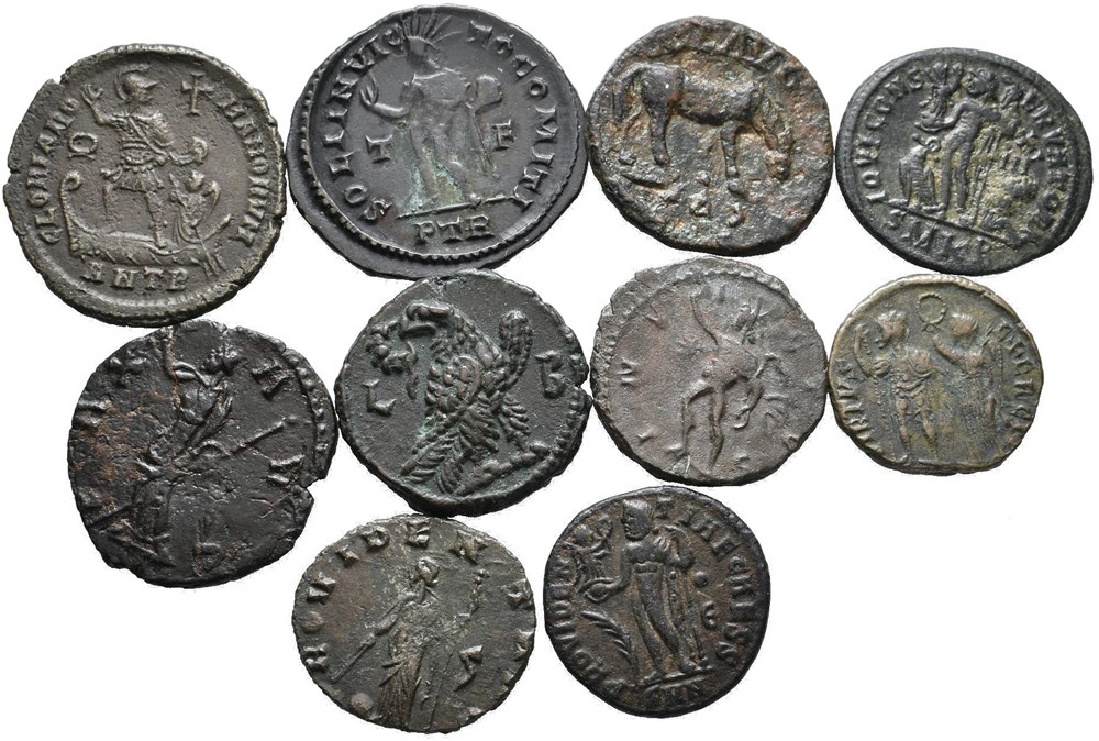 Lot of 10 late Roman bronze coins, of which two are Roman provincial coins. TOTAL of 10 coins in lot. Most with dark patina.