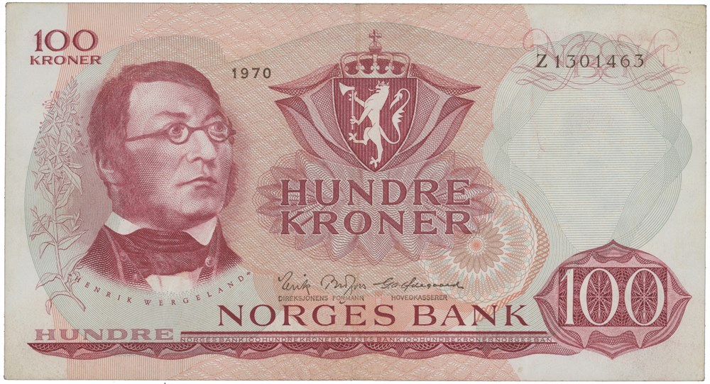 100 kroner 1970. Z1301463. Erstatningsseddel/replacement note (1-million). 2 mm rift oppe.