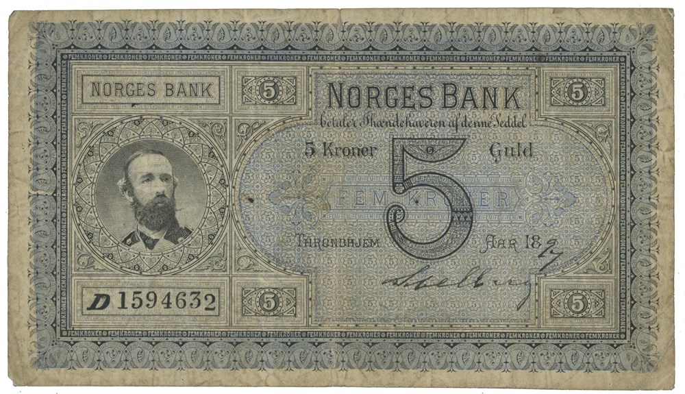 5 kroner 1897 D1594632, sjelden seddel, signert Soelberg, mangler liten del av et hjørne